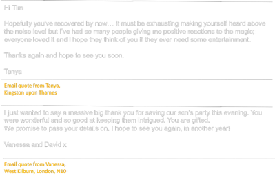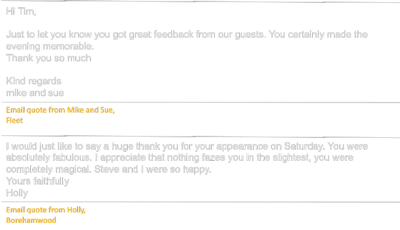 Tim's venues have included innumerable private houses, plus stately homes, top restaurants, and many years as resident Magician at the famous Rolling Stones ‘Sticky Fingers’ restaurant, several other restaurant residencies, and probably every famous London hotel you can name.